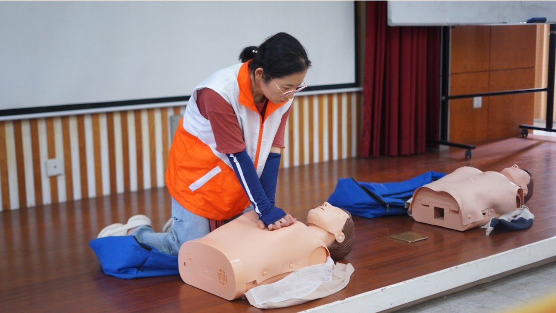 老師傳授了消創(chuàng)傷的止血與包扎方法。包扎考驗的是救護者的耐心與動手能力,不同的部位需要不同的包扎技巧。在整個包扎知識傳授和練習(xí)過程中,整個現(xiàn)場充滿了歡聲笑語。在輕松的環(huán)境下,黨員們學(xué)到了創(chuàng)傷止血與包扎的基本方法。老師講完包扎、骨折固定等實用的急救技術(shù)后,大家還向老師提出傳授排除異物梗阻的方法,老師耐心地講解示范成人和兒童異物梗阻的操作現(xiàn)場實操練習(xí);老師還準備了仿真人模,大家在老師的指導(dǎo)下依次在仿真人模上演練心肺復(fù)蘇、氣道異物梗阻清理、人工呼吸等技術(shù)。在場的黨員們積極參與,老師也現(xiàn)場糾正了員工的一些錯誤做法。