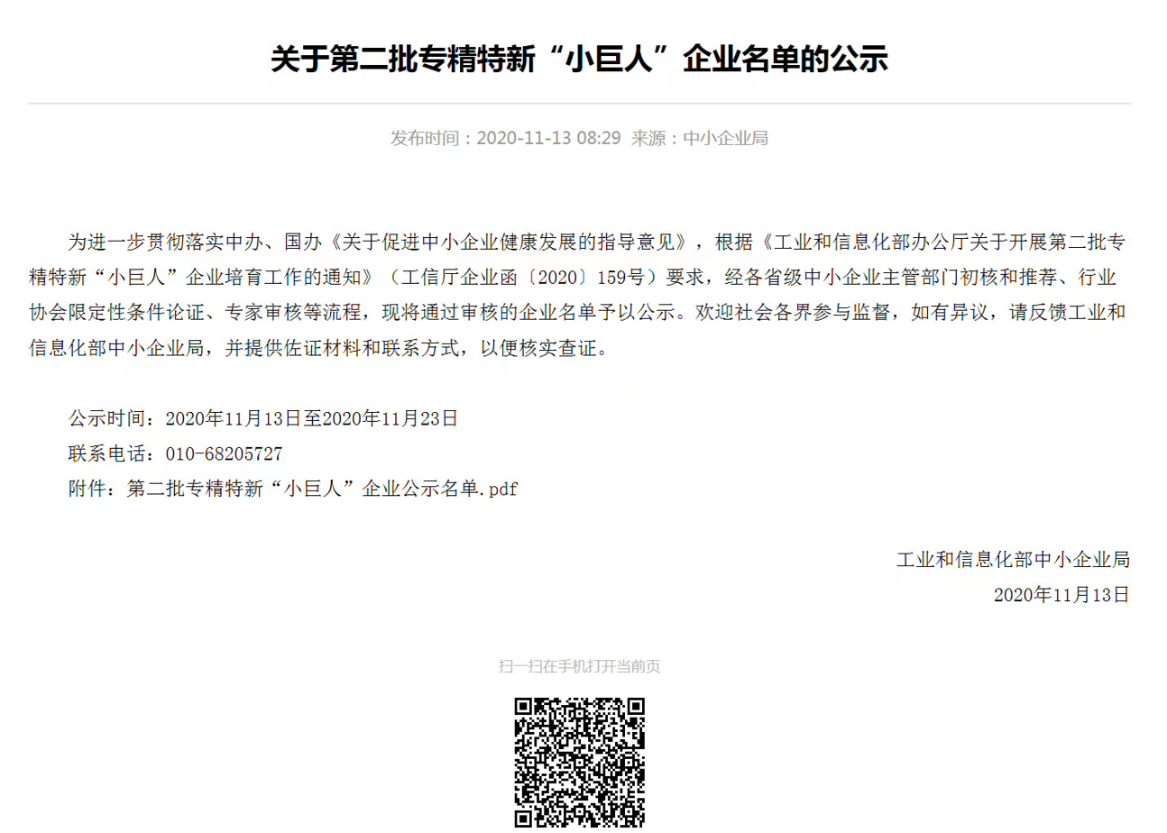 根據《關于組織推薦第二批國家級專精特新“小巨人”企業》文件通知要求,我司通過地方經信推薦,符合申報要求,積極準備相關資料上報,經各地經信部門初審、市級相關部門會審以及省級專家評審,我司順利通過評審,成功入選“國家級專精特新“小巨人”名單,取得國家級榮譽。