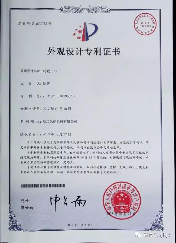 2018年2月榮獲“輪轂”外觀設計專利證書