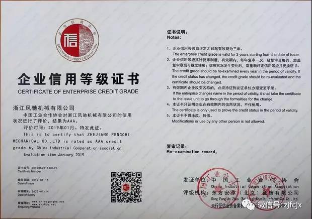 2018年7月榮獲浙江省工商行政管理局頒發的浙江省AAA級“守合同重信用”