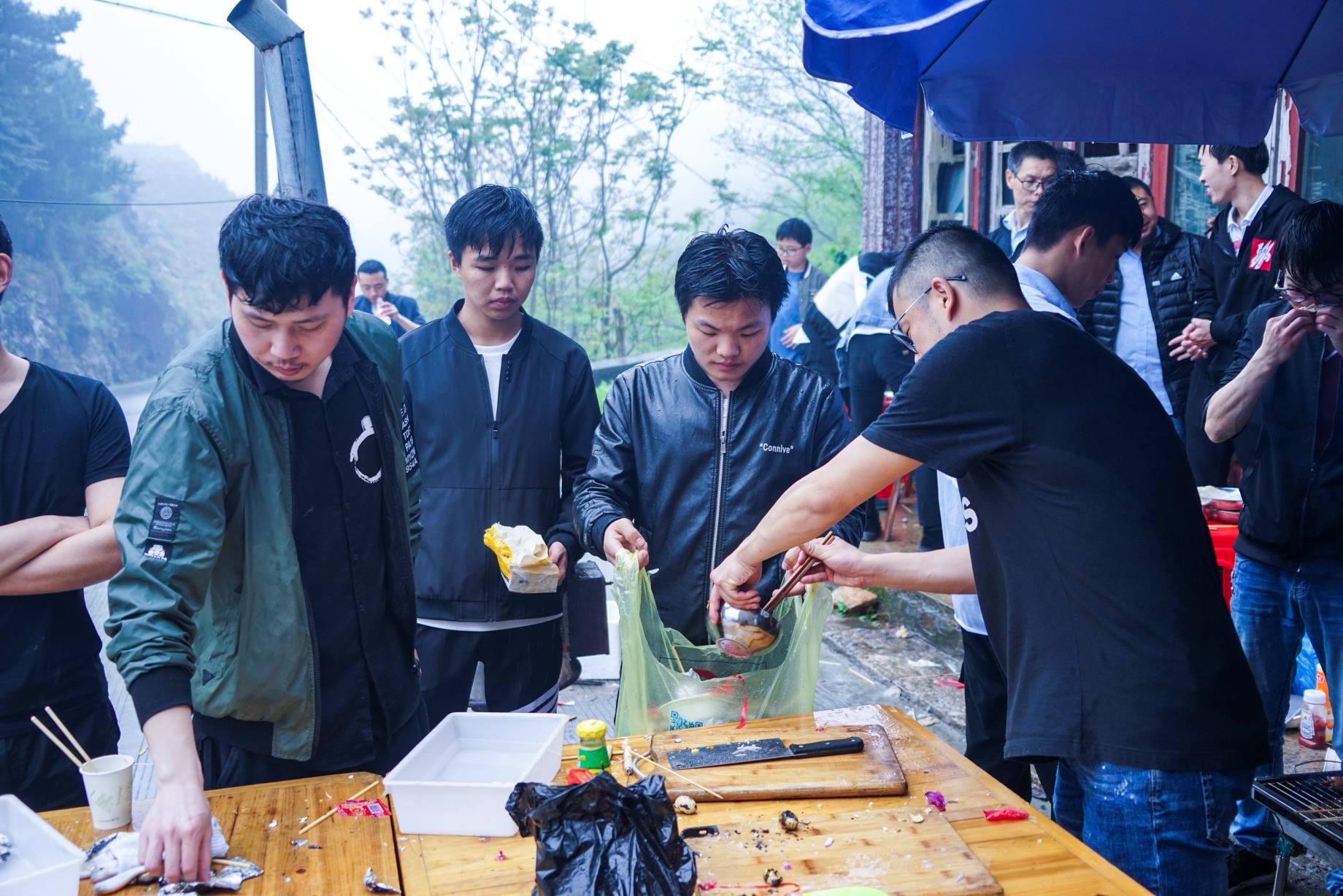 在各組成員吃飽喝足充滿能量之后 ,開(kāi)始了此次活動(dòng)最高潮部分——暴走。在開(kāi)始暴走之前,參加暴走的全體成員在自行車(chē)協(xié)會(huì)牌前集合進(jìn)行了合影留念,之后開(kāi)始了暴走活動(dòng)。天氣依然是跟早上一樣,三米開(kāi)外的地方,似乎什么都看不清了,天空中也下著蒙蒙細(xì)雨,但一點(diǎn)也不影響我們的心情。大家一邊歡快地聊著天,一邊向上地攀登者。享受著霧蒙蒙的風(fēng)景,在這詩(shī)情畫(huà)意中繼續(xù)著。很快我們從平坦的水泥路轉(zhuǎn)到了泥濘的山路中。疊翠的峰巒、茂密的森林和曲折盤(pán)旋的山路讓我們不禁陶醉其中,盡情領(lǐng)略大自然的風(fēng)情。各個(gè)部門(mén)之間都彼此相互鼓勵(lì)、相互協(xié)助,不斷挑戰(zhàn)著自己。