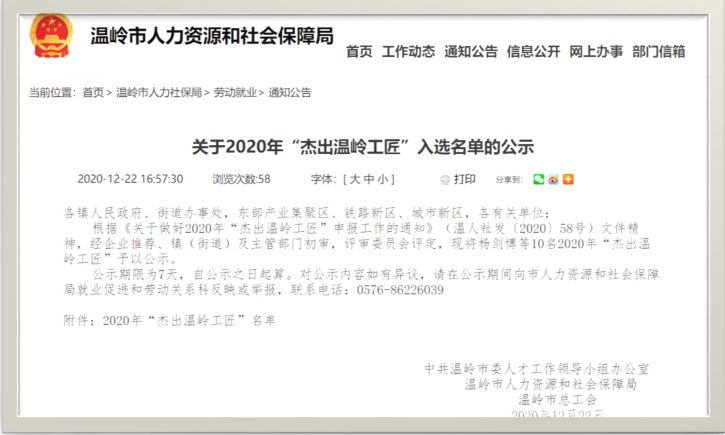 根據《關于做好2020年“杰出溫嶺工匠”申報工作的通知》(溫人社發〔2020〕58號)文件精神,我司研發中心工程平臺車工技師莫朝陽符合申報要求,通過公司推薦,主管部門初審,評審委員會評定,順利通過被評定為“杰出溫嶺工匠”,符合公司價值觀“務實創新”精神。